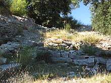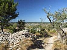 The Oppidum de Roque de Viou is on a hilltop overlooking the valley called the Vaunage, above the village of Nages-et-Solorgues, in Gard, between Nîmes et Sommières, in Languedoc-Rousillon, France. It is in the commune of Saint-Dionizy and is one of six iron-age oppida in the Vaunage; about 200m from the Oppidum de Nages or Oppidum des Castels. It was occupied in three periods between 700 BCE and 600 BCE and between 350 BCE and 300 BCE and around 50 BCE.