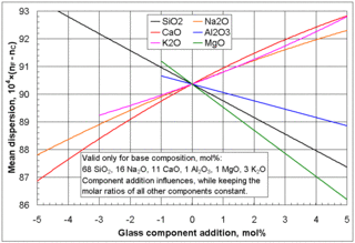 Influences of selected glass component additions on the mean dispersion of a specific base glass (nF valid for λ = 486 nm (blue), nC valid for λ = 656 nm (red))[3]