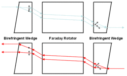 Light traveling in the forward direction is split by the input birefringent wedge into its vertical (0°) and horizontal (90°) components, called the ordinary ray (o-ray) and the extraordinary ray (e-ray) respectively. The Faraday rotator rotates both the o-ray and e-ray by 45°. This means the o-ray is now at 45°, and the e-ray is at −45°. The output birefringent wedge then recombines the two components.