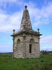 The Macrae Monument, mausoleum, memorial or Orangefield Family Burial Ground was built around 1750 by John Swan and is of the Corinthian style, with alcove, urns and obelisk.[8] Macrae himself died before it was completed and was buried in Monkton church. Smith records the story that a few years after his death, some of Macrae's friends assembled at Orangefield and decided to remove his bones from the Monkton churchyard and to place them in the mausoleum. After two days and nights of constant drinking they selected the largest skull and longest shank bones they could find out of reverence for the Governor and took them to the mausoleum.[9]