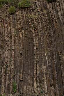 Rosette rock is a radial array of basalt columns.[1] Rosette rock formation seen about 500 metres (1,600 ft) upstream of the Organ Pipes is an overhanging rock on the northern bank of the stream. It is also an outcrop of basalt but with a radial array of columns akin to the spokes of a giant wheel. Its formation is attributed to the cooling of "a pocket of lava, probably in a spherical cave formed from an earlier lava flow".[3]