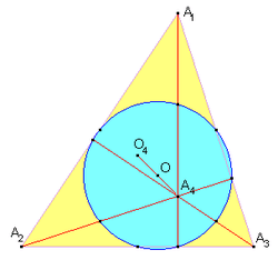 Note that the incenter of this common orthic triangle must be one of the original four orthocentric points. Furthermore, the three remaining points become the excenters of this common orthic triangle. The orthocentric point that becomes the incenter of the orthic triangle is that orthocentric point closest to the common nine-point center. This relationship between the orthic triangle and the original four orthocentric points leads directly to the fact that the incenter and excenters of a reference triangle form an orthocentric system.[2]:p.182