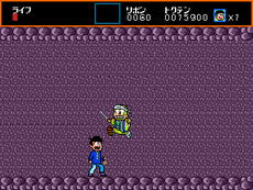 The player controls Osomatsu (leader of the sextuplets) through a total of three stages, armed only with a short-range slingshot. Each stage has a distinct path the players need to follow in order to proceed, though each stage has a variety of different places to go. By pressing the "up" button at an open door the player enters another section of the level, where different items await. By falling into a hole the player enters an underground (or underwater) level, and by jumping on the back of a turtle (or a floating golden platform), the player will be taken to a cloud-world (or somewhere else). In order to fight the boss of each stage, the player has to locate and defeat the stage's mini-boss (Chibita or Dekapan) in order to locate and defeat Iyami, the stage's boss. Every time a boss or mini-boss is defeated, Osomatsu becomes stronger; his life-bar and slingshot distance both increase.
