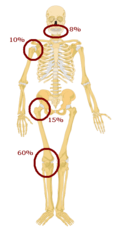 The most commonly affected bones are the proximal humerus, the distal radius, the distal femur, and the tibia,[29] following the basic premise "far from the elbow, close to the knee". Other sites include the ribs, the mandible, the spine, and the pelvis. Rarely, osteosarcoma may arise from soft tissues (extraskeletal osteosarcoma). Metastasis of tumors involving the limb bones is very common, usually to the lungs. The tumor causes a great deal of pain, and can even lead to fracture of the affected bone. As with human osteosarcoma, bone biopsy is the definitive method to reach a final diagnosis. Osteosarcoma should be differentiated from other bone tumours and a range of other lesions, such as osteomyelitis. Differential diagnosis of the osteosarcoma of the skull in particular includes, among others, chondrosarcoma and the multilobular tumour of bone.[30][31]