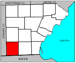 Whiteford Township was organized in March 1834 and carved out of western parts of Erie Township and the former Port Lawrence Township.[3] It was named after Gen. David White, the township's first supervisor and a pioneer settler. At the time of founding, Whiteford Township was a much larger township in land area than it is today. It originally extended into present-day Ohio, when that part of the state (known as the Toledo Strip) was claimed by both Ohio and Michigan during the Toledo War.[4] This larger Whiteford Township included most of present-day Sylvania, Sylvania Township, northern Springfield Township and a small section of present-day Toledo north of Airport Highway between Reynolds Road and Holland-Sylvania. However, by December 1836, the boundary dispute between Ohio and Michigan had been settled, the Toledo Strip was awarded to Ohio, and Whiteford Township subsequently lost all of its territory south of this newly agreed upon state boundary.