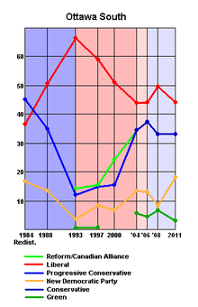 As of the 2011 election, Ottawa South is one of two Ottawa ridings currently by a Liberal. The Liberal Party has held the riding since its creation in 1988. The closest election was a 7% Liberal win in 2006. The riding has voted Liberal even during Progressive Conservative and Conservative governments. If the riding's boundaries were not changed before the 1984 election, however, the Progressive Conservative candidate may have won that vote. The New Democratic Party received its greatest level of support in the 2011 election at 18%. The Greens saw their highest vote here in 2008 with 7%.