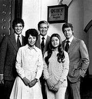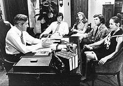 Marshall (Arthur Hill) with clients. From left: Michael Witney, Sharon Gless, John Davidson, Louise Sorel, 1972. | |