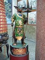 Ox-Head (simplified Chinese: 牛头; traditional Chinese: 牛頭; pinyin: niútóu; Wade–Giles: niu2-t'ou2) and Horse-Face (simplified Chinese: 马面; traditional Chinese: 馬面; pinyin: mǎmiàn; Wade–Giles: ma3-mien4) are two guardians or types of guardians of the Underworld in Chinese mythology. As indicated by their names, both have the bodies of men, but Ox-Head has the head of an ox while Horse-Face has the face of a horse. They are the first beings a dead soul encounters upon entering the Underworld; in many stories they directly escort the newly dead to the Underworld.