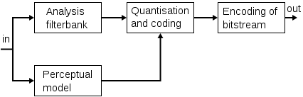The input signal is decomposed into subsampled spectral components. For each sample an estimation of the actual masked threshold is derived using rules known from psychoacoustics. This is the perceptual model of the encoding system. The spectral components are quantized and coded keeping the quantization noise below the masked threshold. Finally is formed the bitstream.