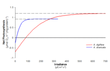 As can be seen in the graph, two species can have different responses to the same incremental changes in light intensity. Population A (in blue) has an initial rate higher than that of Population B (in red) and also exhibits a stronger rate change to increased light intensities at lower irradiance. Therefore, Population A will dominate in an environment with lower light availability. Although Population B has a slower photosynthetic response to increases in light intensity its Pmax is higher than that of Population A. This allows for eventual population dominance at greater light intensities. There are many determining factors influencing population success; using the PI curve to elicit predictions of rate flux to environmental changes is useful for monitoring phytoplankton bloom dynamics and ecosystem stability.
