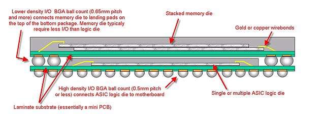 - Only "known good" packages are used in final assembly (if the memory is bad only the memory is discarded and so on). Compare this to stacked-die packages where the entire set is useless and rejected if either the memory or logic is bad.