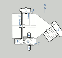 The dimensions of the hall (1,000 m2) were suitable to the reception of several hundreds of people at the same time:[20] although the building has been destroyed, it is known it was 47,42 metres long, 20,76 metres large and 21 metres high.[15] The plan seems to be based upon the Roman 'aula palatina of Trier. The structure was made of brick, and the shape was that of a civil basilica with three apses: the largest one (17,2 m),[15] located to the West, was dedicated to the king and his suite. The two other apses, to the North and South, were smaller. Light entered through two rows of windows. The inside was probably decorated with paintings depicting heroes both from the Ancient times and contemporary.[3] A wooden gallery girdled the building between the two rows of windows. From this gallery could be seen the market that was held North of the Palace. A gallery with porticos on the southern side of the hall gave access to the building. The southern apse cut though the middle of this entrance.[3]