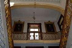 The interior is marked by a ample atrium, with stone floors, azulejo tile, stucco and white-painted walls, divided by pilasters.[1] From this atrium is a staircase that extends to the second floors, with an intermediary landing that divides into two flights of parallel staircases with worked iron guardrails and eight-sided lantern.[1] All the halls has stucco ceilings and walls with painted white.[1] The dance hall has a vaulted ceiling with musical decorations and a small varanda.[1]