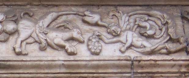 Between hojarascas one can see a nude character that carries a pendant of grapes that offers to an animal in fierce attitude. It is Baco, soothing the wild beasts with the help of wine.