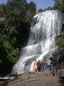 - Kumbakarai Falls located in the lower Palni foothills, along the Kodai-Vellagavi-Periyakulam foot path at . These falls have two stages. At the first stage water collects in huge rock recesses which are each named after wild animals such as tiger, elephant and snake. The Pambar river then flows .5 kilometres (0.31 mi) to the second stage before falling as the main waterfall.[23] Bathing is allowed. There is a bus from Periyakulam with fare of Rs. 5(6.00,7.00 13.00,15.30,16.30 hrs).