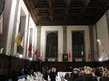 According to Giovanni Villani's Cronica, in 1267 the Florentine Guelph party did not own a seat, and held its meeting in the church of Santa Maria sopra la Porta. In the early 14th century, a first building was erected near the church, to which, in the following century, a further construction on the modern Via delle Terme and a larger one at the corner with via di Capaccio were added (the latter would house the meeting hall). According to some sources, Filippo Brunelleschi was involved in the design of the hall at the first floor.[1]