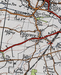 "Palgrave, a village and a parish in Hartismere district, Suffolk. The village stands near the boundary with Norfolk, 1 mile S w of Diss r. station, and 4 N W of Eye; and has a Wall letter-box under Diss. The parish comprises 1, 474 acres. Real property, £3, 601. Pop., 739. Houses, 160".[3]