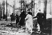 At the glade the prisoners' bags were taken but they were permitted to keep their documents and small belongings. Jews could keep their yellow badges, and people who worked in Pawiak's infirmary could keep their badges with the Red Cross symbol. Sometimes prisoners' hands were tied and their eyes blindfolded. The victims were then taken to the edge of the grave and executed by machine gun fire. Sometimes victims were forced to hold a long pole or ladder behind their back. Such supports were later lowered so that the bodies fell into the grave in an even layer. Postwar exhumation proved that the wounded victims were sometimes buried alive.[12][15] SS and OrPo members photographed the executions until it was forbidden by the SS-Standartenführer Meisinger, as happened on 3 May 1940.[16] After the execution was finished, the graves were filled in, covered with moss and needles, and then planted over with young pine trees. Families of the victims were later informed by the Nazi authorities that their relatives had "died from natural causes".[11][17]