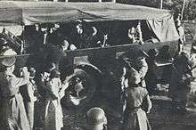 Victims were transported to the place of execution by trucks. Usually they were brought from Pawiak prison, rarely from Mokotów Prison. SS soldiers tried to convince their victims that they are going to transfer them to another prison or to a concentration camp. For this reason, death transports were usually formed at dusk and prisoners were allowed to take their belongings with them. Sometimes before departure convicts received an additional food ration and they were given back their documents from the prison's depository.[12] Initially, these methods were so effective that the prisoners were not aware of the fate awaiting them.[13] Later, when the truth about what was happening in Palmiry spread through Warsaw, some victims tried to throw short letters or small belongings from the trucks, in hopes that in this way they would be able to inform their families about their fate.[12] During postwar exhumation some bodies were found with a card reading "Executed in Palmiry", written by the victims shortly before their death.[14]