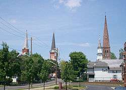 Palmyra claims to be the only city or village in the U.S. to have four churches at a four corner intersection facing each other.[2] It is one of ten places in the world that has four churches on the four corners of two intersecting highways. The "four corners" churches are located at the intersection of New York State Route 21 and New York State Route 31.