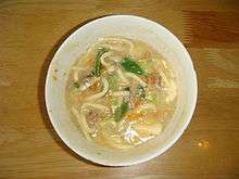 Lomi or Pancit Lomi is a Filipino dish made with a variety of thick fresh egg noodles of about a quarter of an inch in diameter, soaked in lye water to give it more texture. Because of its popularity at least in the eastern part of Batangas,[1] there are as many styles of cooking lomi as there are eateries, panciterias or restaurants offering the dish. Variations in recipes and quality are therefore very common.
