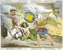 In Sin, Death and the Devil (1792), James Gillray caricatured the political battle between Pitt and Thurlow as a scene from Paradise Lost. Pitt is Death and Thurlow Satan, with Queen Charlotte as Sin in the middle.