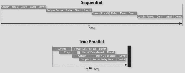 The parallel parametric test is an emerging strategy for wafer-level parametric testing that involves concurrent execution of multiple tests on multiple scribe line test structures. If offers the potential for increasing test throughput with existing test hardware, in response to market pressure on fabs to minimize test times. The figure illustrates the differences in the amount of time required to complete tests sequentially as compared to the same tests in parallel.
