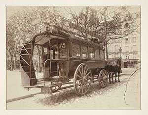 At the beginning of the Belle Époque, the horse-drawn omnibus was the primary means of public transport. In 1855, Haussmann had consolidated ten private omnibus companies into a single company, the C.G.O. (Compagnie générale des Omnibus) and gave it the monopoly on public transport. The coaches of the CGO carried twenty-four to twenty-six passengers and ran on thirty-one different lines. The omnibus system was overwhelmed by the number of visitors at the 1867 Exposition, so in 1873 the city began to develop a new system of tramways. The omnibus continued to run, with larger cars that could carry forty passengers in 1880, and then, in 1888-89, a lighter vehicle which could carry thirty passengers, called an omnibus à impériale. The horse-drawn tramway gradually replaced the horse-drawn omnibus. In 1906, the first motorized omnibuses began to run on Paris streets. The last horse-drawn omnibus run took place on January 11, 1913 between Saint-Sulpice and La Villette.[34]
