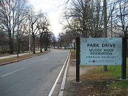 Park Drive runs alongside the Muddy River from its beginning at Boylston Street to its intersection with Brookline Avenue.[1] The Fenway, which is located on the other side of the Back Bay Fens,[1] allows for continuous travel in the opposite direction of Park Drive. It is accessible from where Park Drive becomes two-way at Brookline Avenue and ends on Boylston Street near where Park Drive begins.[2]