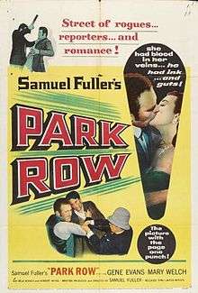 Park Row is a 1952 drama film starring Gene Evans as a New York City journalist who founds a new type of newspaper and Mary Welch as the established publisher who opposes him. It was written, directed, produced and financed by Samuel Fuller, himself a New York reporter prior to turning to filmmaking. It was his favorite film,[1] though it did not do well at the box office.