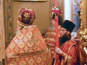 The paschal trikirion is held by the serving priest (whether a bishop or a presbyter) in contrast to the bishop's trikirion which the bishop uses for blessing and is held or carried alongside the bishop. It is used from the commencement of the celebration of the Resurrection during the Paschal Vigil through the end of Bright Week, and also on the Apodosis of Pascha,[4] when it is used at sundry times, in particular, while chanting the paschal verses at the beginning of Vespers, Matins and the Divine Liturgy, while censing,[3] during the Little Entrance, and when giving the paschal greeting.
