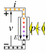 In practice it is not necessary to assign the voltage and current variables in a circuit to comply with the PSC. Components in which the variables have a "backward" relationship, in which the current variable enters the negative terminal, can still be made to comply with the PSC by changing the sign of the constitutive relations (1) and (2) used with them.[5] A current entering the negative terminal is equivalent to a negative current entering the positive terminal, so in such a component[5][7]