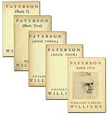 Paterson is an epic poem by American poet William Carlos Williams published, in five volumes, from 1946 to 1958. The origin of the poem was an eighty-five line long poem written in 1926, after Williams had read and been influenced by James Joyce's novel Ulysses. As he continued writing lyric poetry, Williams spent increasing amounts of time on Paterson, honing his approach to it both in terms of style and structure. While The Cantos of Ezra Pound and The Bridge by Hart Crane could be considered partial models, Williams was intent on a documentary method that differed from both these works, one that would mirror "the resemblance between the mind of modern man and the city."[1]