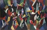 Bruce exhibited regularly in the Salon d'Automne, and met many of the leading artists of the early twentieth century avant garde. During a period of close friendship with Sonia and Robert Delaunay in 1912–14 his paintings were influenced by Orphism, but Bruce never formed an attachment to any school. Although he never exhibited with the Synchromists or gave his paintings Synchromist titles,[2] in 1916 he developed a form of abstract painting that strongly resembled Morgan Russell's synchromist compositions of muscular, flat color areas (for example, see Bruce's Composition I).[3]