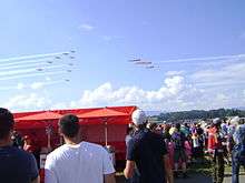 As of the summer of 2014 the new plan is that by the end of 2016 the team will move from six F-5Es to four F/A-18Cs. Fewer air displays will be flown and the aircraft will probably not receive special paint.[5] There are still plans by the Swiss Air Force and in the Swiss parliament to operate eighteen F-5E and four F-5F until 2018. This would also include the continued operation of the Patrouille Suisse flying the F-5E until 2018.[6][7] A unique Flight Demonstration was performed by the Patrouille Suisse on September 7, 2014 at the Air14 Air Show in Payerne as they flew a 15-plane display with the PC-7 Team.[8]