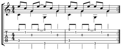 The thumb (T) alternates between bass notes, often on two different strings, while the index (I) and middle (M) fingers alternate between two treble notes, usually on two different strings, most often the second and first. Using this pattern on a C major chord is as follows in notation and tablature: