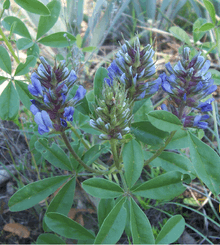 Pediomelum cuspidatum (also known as Psoralea cuspidata) is a perennial herb also known as the buffalo pea, largebract Indian breadroot and the tall-bread scurf-pea. It is found on the black soil prairies in Texas. It has an inflorescence on stems 18-40 centimeters long arising from a subterranean stem and deep carrot-shaped root that is 4-15 cm long. The long petioled leaves are palmately divided into 5 linear-elliptic leaflets that are 2-4 centimeters long. The flowers, borne in condensed spikes from the leaves, are light blue and pea-like.
