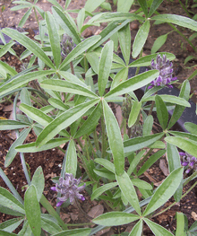 It has an inflorescence on stems 5-6 centimeters long, separate from the leaves, arising from a subterranean stem and deep carrot-shaped root that is 3-7 cm long. The long petioled leaves are palmately divided into 5 linear-elliptic leaflets that are 3-5 centimeters long. The flowers, borne in condensed spikes separate from the leaves, are purple and pea-like, and have a surprisingly strong scent, reminiscent of lemon furniture polish. The species has edible tuberous roots, high in protein.
