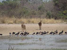 There are also good populations of several other large herbivores like Sudanese buffaloes (Syncerus caffer brachyceros; c. 2,700 animals in 2000), western hartebeests (Alcelaphus buselaphus major; c. 1,500 in 2000), roan antelope (c. 2,000 in 2000), kob antelope (c. 2,600 in 2000), and warthogs. Some other antelope species like korrigum (Damaliscus lunatus korrigum), bushbuck, and reedbuck are relatively rare. smaller bovids are the red-flanked duiker, oribi, and common duiker. Primates are represented by olive baboon, patas monkey, and tantalus monkey.[1]