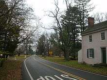 When Pennsylvania first legislated routes in 1911, what is now PA 32 was designated as part of Legislative Route 252 between Morrisville and Yardley.[5] PA 32 was designated in 1927 to run between Philadelphia and US 611/PA 2 in Kintnersville, heading northeast along US 13 to Morrisville before turning northwest on its present alignment. At this time, the entire route was paved.[6][7] In 1928, the southern terminus was cut back to US 1 (Bridge Street) in Morrisville, removing the concurrency with US 13.[8] In 1932, a parkway was proposed along the route from Morrisville to New Hope; however, it was never built.[9] In 1969, another proposal was created for a $30 million PA 32 freeway from I-95 near Yardley to US 202 in New Hope. At the time, this freeway was to be completed by 1985. However, the proposal never came about.[10] In the 1980s, PA 32 was extended southwest to its current terminus, replacing a part of US 1 Alt., which had replaced the earlier US 1 designation, on Bridge Street.[11]