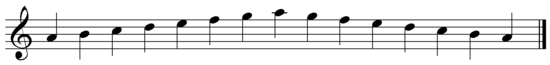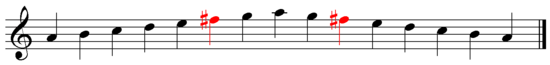 Most minor Sacred Harp tunes are notated in the natural minor, as given above. However, in Sacred Harp singing, it is common to sing the sixth degree of the minor scale, wherever it may appear, one semitone higher than it is written. In musical terminology, the minor scale that results is called the Dorian mode. In the following notation, the notes that in Sacred Harp are called “raised sixths” are shown in red.