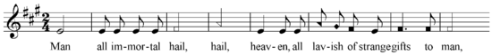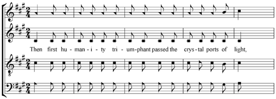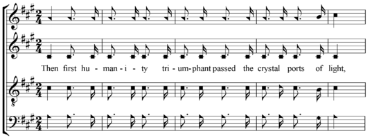 An example can be found in the following passage from the "Easter Anthem" of William Billings. Billings wrote the passage in even musical rhythm, and this is reflected in how it is printed in The Sacred Harp: