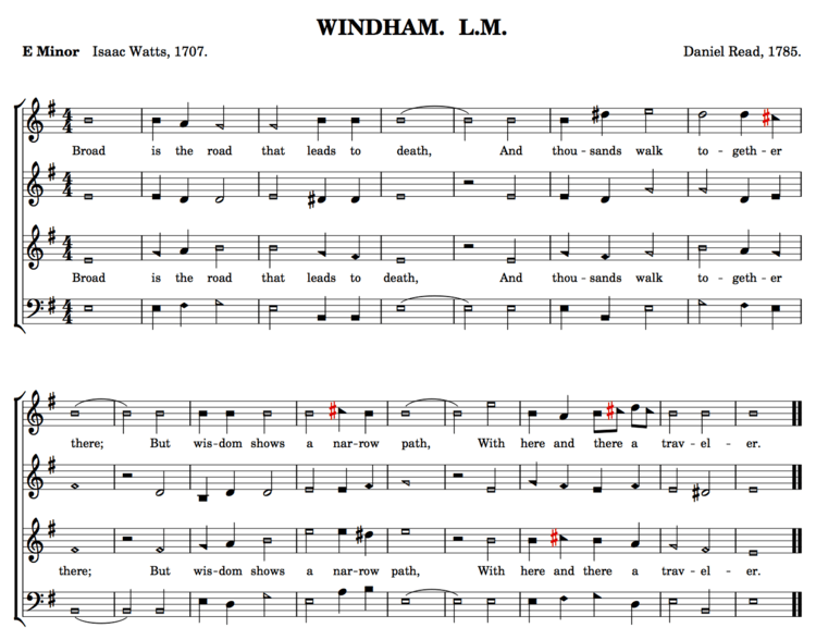 Some minor tunes, including Windham (below), are printed with a raised seventh scale degree. Such accidentals are ignored by many traditional singers, making all minor tunes diatonic (either Aeolian or Dorian).