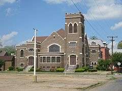 The Perry Street Historic District encompasses a fine collection of early-20th century architecture in Helena-West Helena, Arkansas. It includes fifteen buildings, arrayed on the single city blocks stretching south and west from the junction of Perry and Pecan Streets. The buildings on these blocks represent a cross-section of private and public architecture spanning 1880-1030, including two churches, the only synagogue in Phillips County (the 1913 Temple Bethel), and the county's oldest public building, the 1879 Helena Library and Museum. Most of the residences in the district were built between 1900 and the 1920s. Although most of the residential architecture is Arts and Crafts in style, it includes two fine Queen Anne Victorians: the Moore House at 608 Perry (built 1900) and the William Nicholas Straub House at 531 Perry (also built 1900).[2]