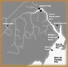 The Petitcodiac is situated between two smaller rivers – the Shepody River (off Shepody Bay) and the Memramcook river (the three bodies of water were often called "Trois-Rivières" by its inhabitants.) Weeks after the Expulsion began with the Bay of Fundy Campaign (1755), the British forces raided villages at Chipoudy and Petitcodiac (Hillsborough, New Brunswick). As well, on November 17, 1755, George Scott took seven hundred troops and attacked twenty houses at Memramcook (Dorchester, New Brunswick). They arrested the Acadians that remained and killed two hundred head of livestock.[7] Even after these raids, Acadians returned to these villages and the numbers grew as the deportation from peninsula Nova Scotia continued, followed by the deportation of present-day Prince Edward Island and Cape Breton.