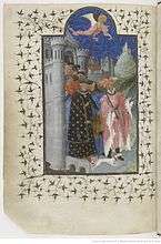 American art historian Millard Meiss distinguishes five separate contributors to the work and identifies Le Noir with "the Passion Master", an anonymous illuminator so-called because he illustrated the Passion.[7] His characteristics have been described as "rather cool, dusty colours" and a "delightful, often humorous depiction of animals", also rocky scenery and agitated figures with expression.[8] Jacquemart de Hesdin worked on the Hours of the Virgin. Characteristics are a reprentation of space influenced by Italian painting, and and a "more realistic rendering of reality", based on collaboration with Jan Boudolf of Bruges.[9] The styles of Jacquemart de Hesdin and Pseudo-Jacquemart are very similar because they worked together for more than 20 years. The latter has been described as copying the style of others rather than being creative.[10]