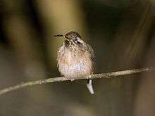 The dusky-throated hermit (Phaethornis squalidus) is a species of hummingbird in the Trochilidae family. It is endemic to humid Atlantic Forest in south-eastern Brazil. It formerly included the streak-throated hermit as a subspecies. A small hermit with a total length of approximately 9 cm, it has pale buff underparts and dark streaks on the throat.