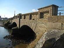 Brannon went on to design a concrete road bridge and toll house over the river Axe at Seaton, Devon, which was funded by the Seaton and Beer Railway Company. Now known as Axmouth Old Bridge, the three-span structure, which opened in 1877, was the second concrete bridge to be built in Britain, and is the oldest still standing. It is made of mass concrete without reinforcement, although in 1956 steel relieving beams were added to counteract the weakness of the central span under traffic loads.[12] An adjacent road bridge has superseded it, but it survives for use by foot traffic as part of the South West Coast Path. It is a Grade II listed Ancient Monument. The toll house also still stands and is used as a private dwelling.