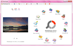PhotoScape is a graphics editing program, developed by MOOII Tech, Korea. The basic concept of PhotoScape is 'easy and fun', allowing users to easily edit photographs taken from their digital cameras or even mobile phones. PhotoScape provides a simple user interface to perform common photo enhancements including color adjustment, cutting, resizing, printing and GIF animation.[1][2] Photoscape operates on Microsoft Windows systems and Mac. It is not available on Linux systems. The default languages are English and Korean, with additional language packages available for download.