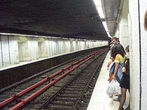 Piaţa Romană (Romanian for "Roman Square") is a metro station in central Bucharest, located in the square with the same name, on the main north-south axis of the city centre. It was not included in the initial plans of the network and was added at a later stage due to increasing demand. Because of this, the platforms are asymmetrical, very narrow (less than 1.5 m wide) and the waiting area is in a corridor separated by thick walls from the platforms in order to sustain the station's structure in the sandy soil, on which a number of 1920s high-rises are also situated.